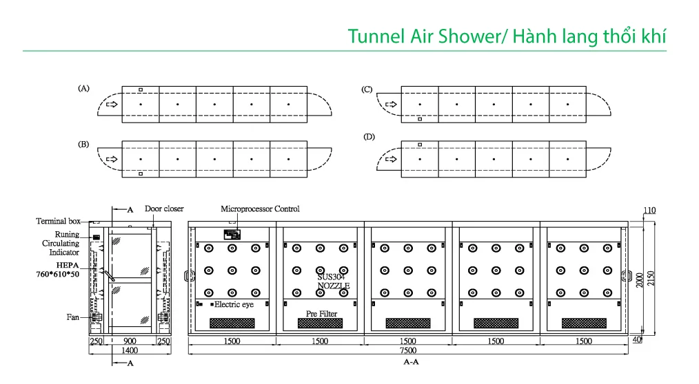 - Buồng Thổi Khí Dạng Hầm: Là các đơn vị dài hơn có thể chứa một dòng người hoặc thiết bị liên tục, lý tưởng cho phòng sạch có lưu lượng lớn.