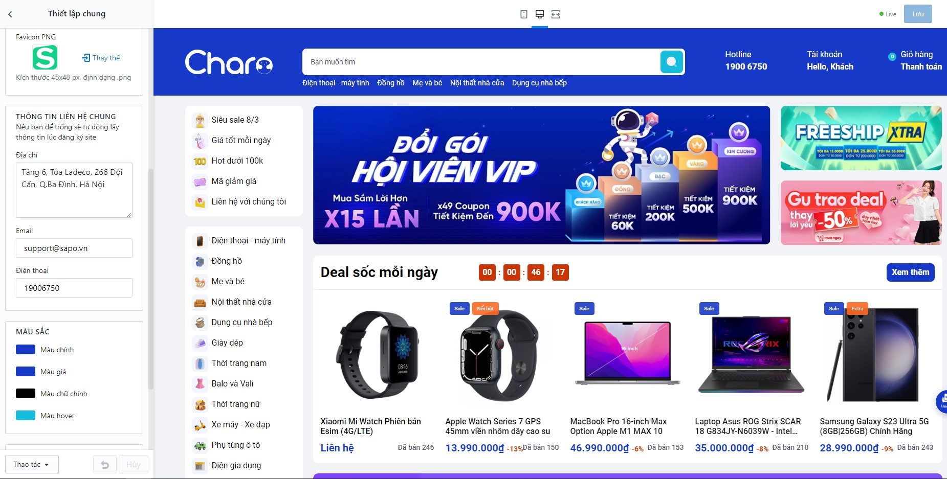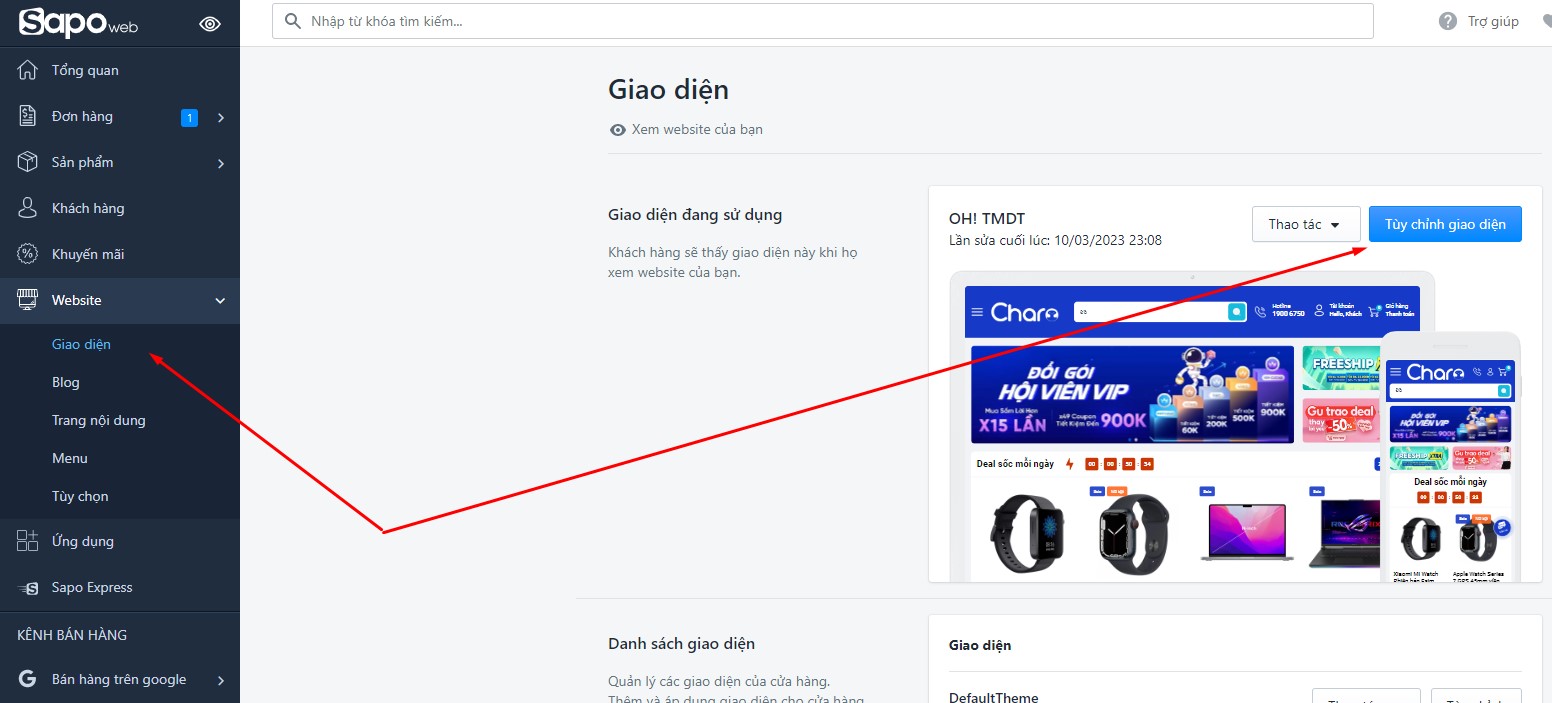 Sau khi cài đặt theme mới lên cửa hàng, bạn bấm vào THIẾT LẬP GIAO DIỆN để tùy chỉnh theme: