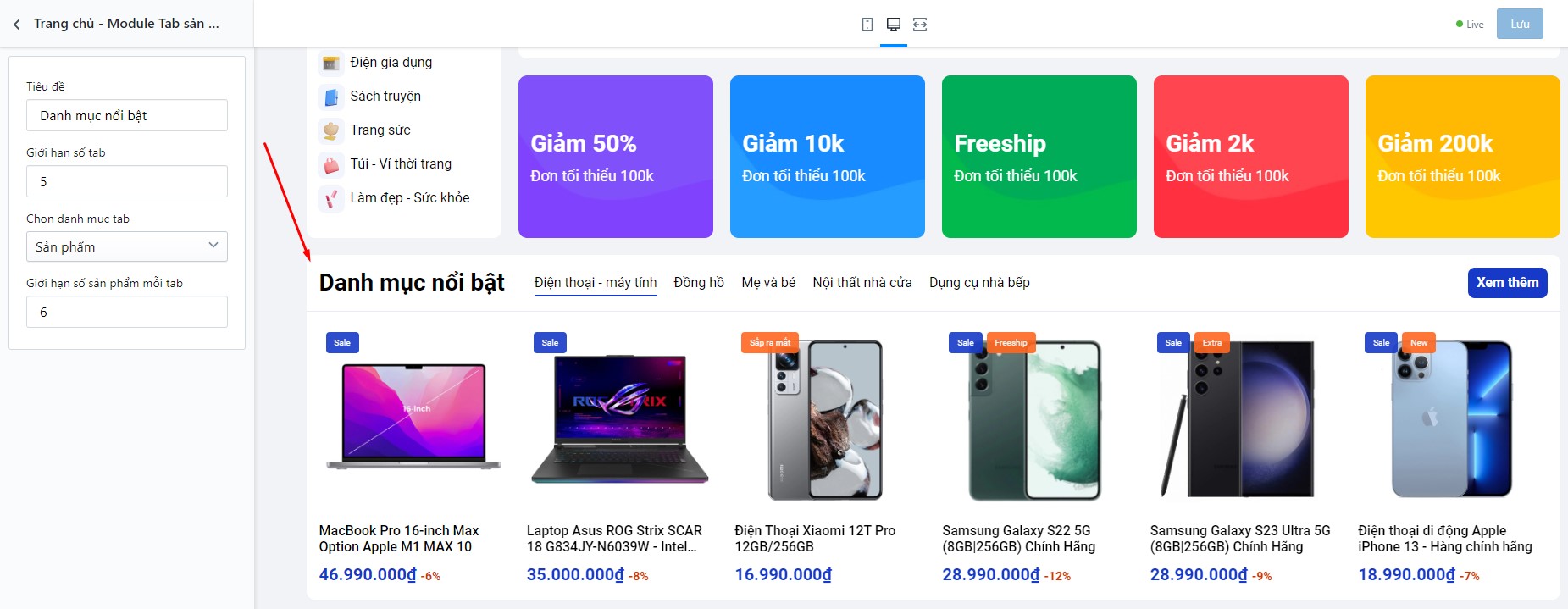 Để thiết lập Tab sản phẩm, bạn cần tìm đến Trang chủ - Tab sản phẩm
