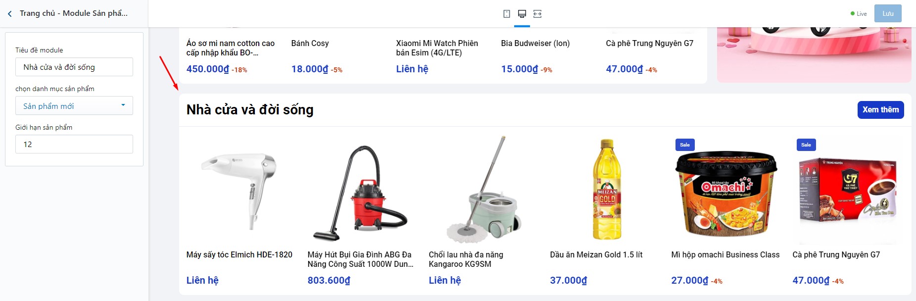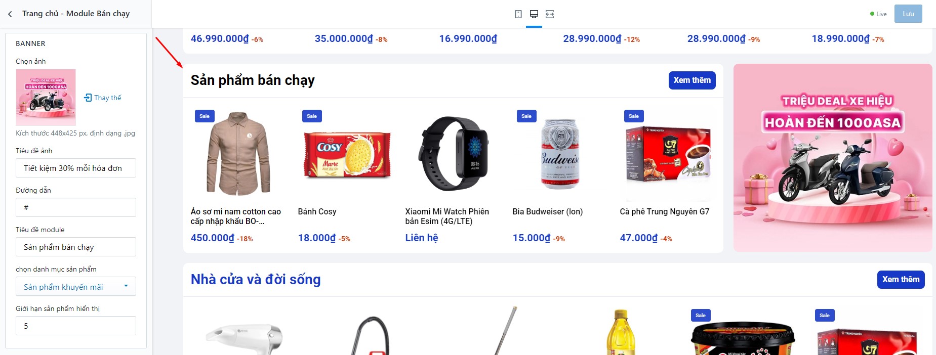 Để thiết lập Sản phẩm bán chạy, bạn cần tìm đến Trang chủ - Bán chạy