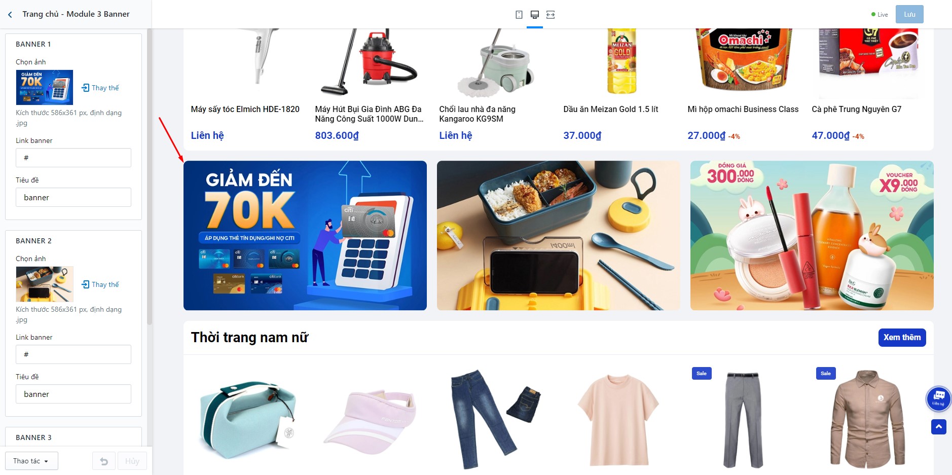 Để thiết lập 3 banner giữa trang, bạn cần tìm đến Trang chủ - Banner
