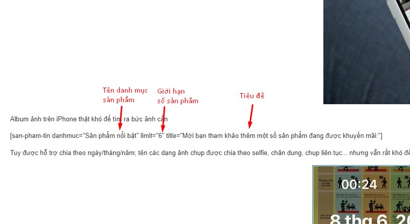 [san-pham-tin danhmuc="Tên danh mục" limit="Số giới hạn sản phẩm" title="Tiêu đề phần sản phẩm"]
