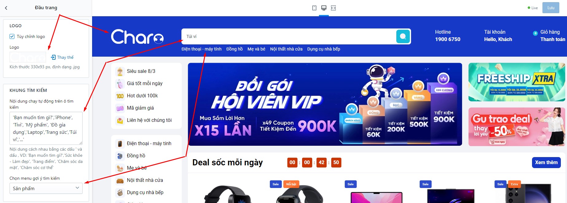 Tại đây cho phép bạn thay đổi Logo, Khung tìm kiếm: