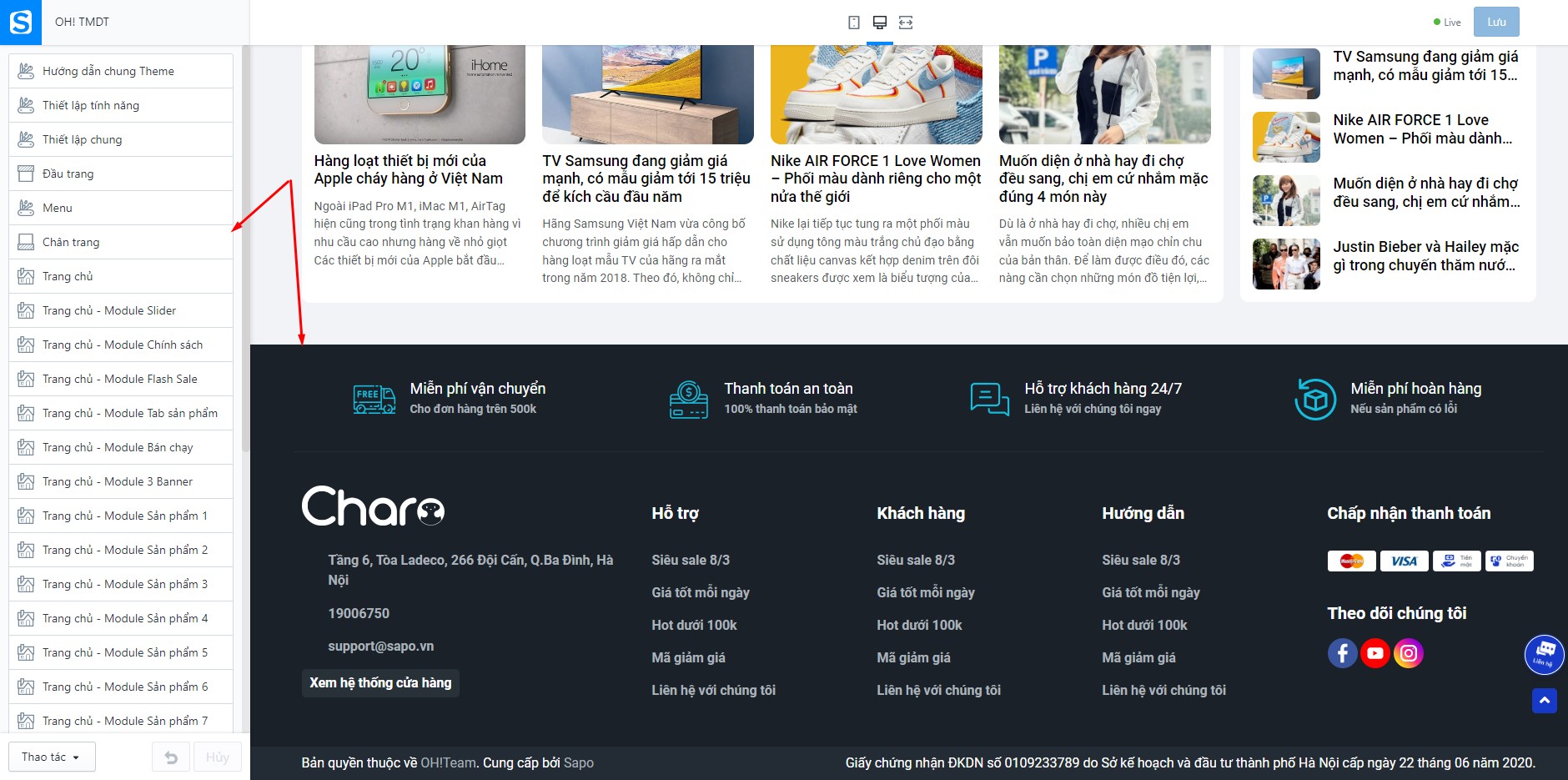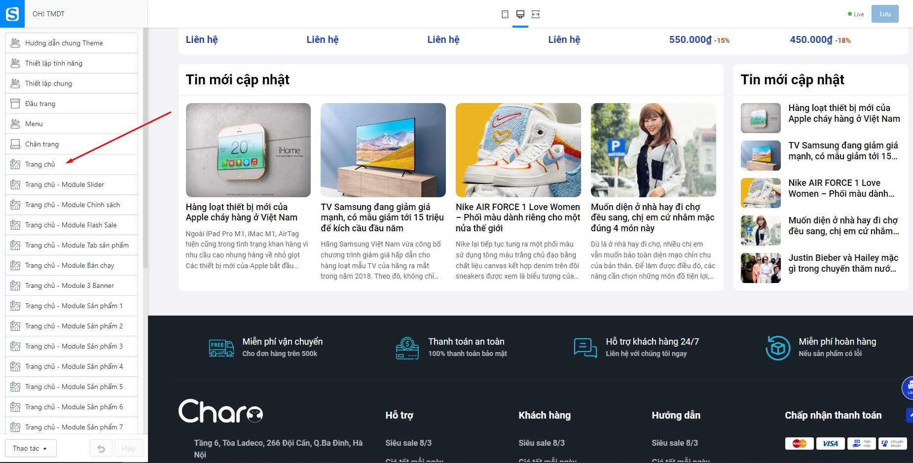 Để chọn lựa và sắp xếp các module trang chủ, bạn cần tìm đến thiết lập TRANG CHỦ: