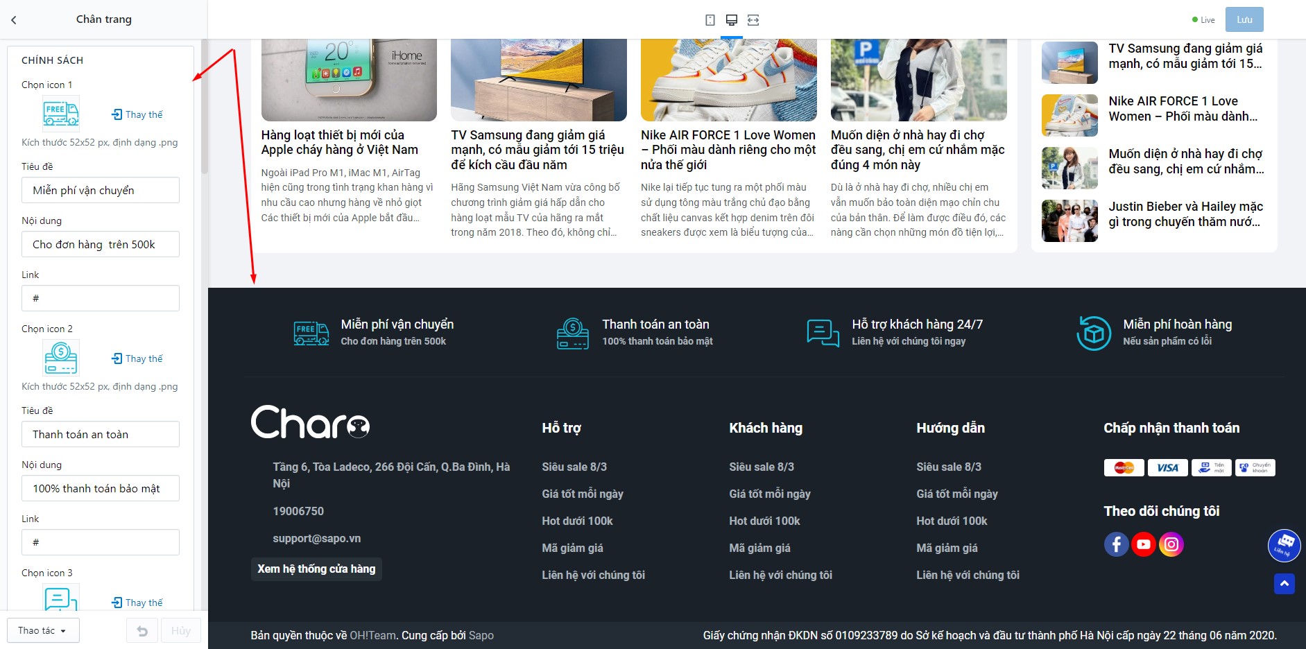 Tại đây bạn có thể thiết lập các chính sách, tiêu đề, menu, các thông tin bản quyền vv...