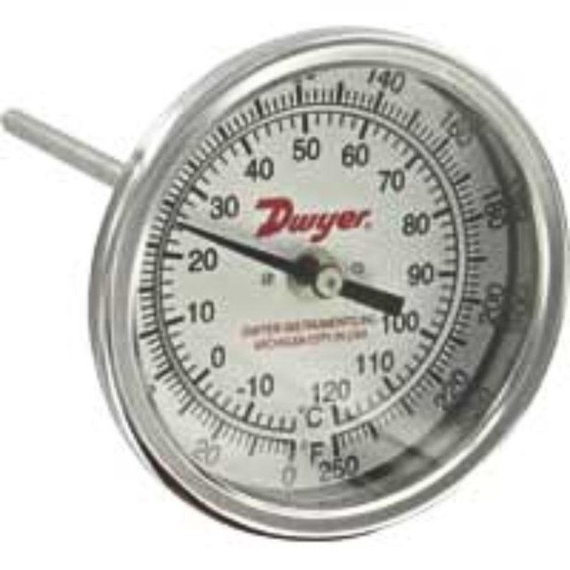 Nhiệt kế lưỡng kim, mặt số 3 “, chiều dài thân 4”, phạm vi 0/250 ° F (-20 / 120 ° C), vạch chia 2 ° F (2 ° C). |